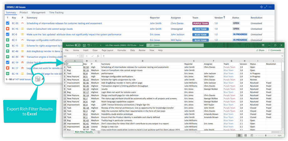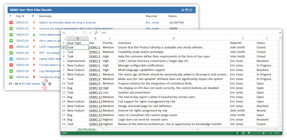 Introducing - Rich Filters::PDF Reports for Jira all of the Rich Filter gadgets on a Jira dashboard Create a Report From a Rich Filter Dashboard Create one PDF report from all of the Rich Filters gadgets on a Jira dashboard to share with your colleagues or customers. Customize the report by applying quick filters before exporting to PDF.