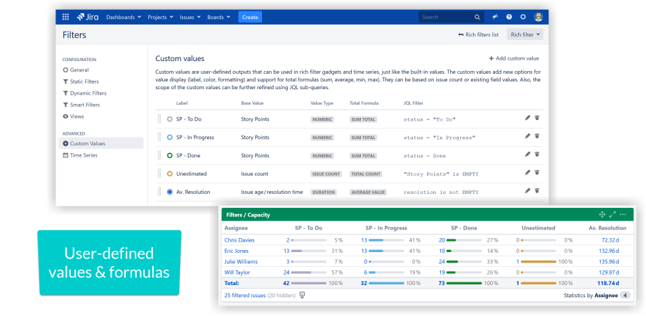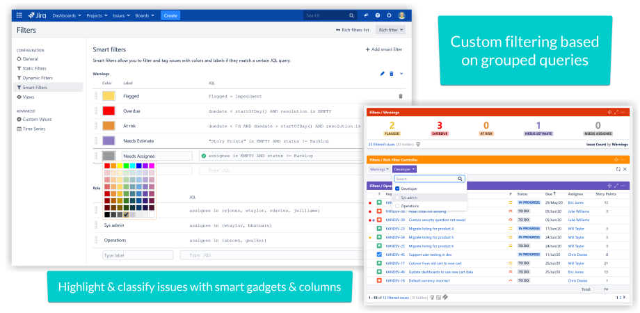 User's Guide - Rich Filters for Jira Dashboards 1.24 ... the rich filter gadgets bring a lot of new functionality to the jira dashboards: dynamically change the data displayed by the dashboard, highlight and color-code issues, define and display computed fields, build statistics based on issue fields and/or user defined criteria, define and display multiple personalized views for an issue collection …