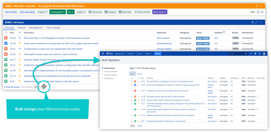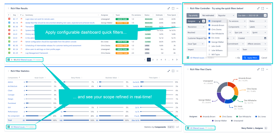 Rich Filters - dynamic Jira dashboards - Qotilabs Build powerful interactive Jira dashboards in minutes The Rich Filters Gadgets will transform your dashboards from static to truly dynamic and interactive operational boards. Let the users find what they need in just a few clicks! Play Video Live Demo Quick filters on dashboards Control the data displayed by the rich filter gadgets in one click.