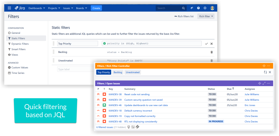 Rich filters for jira dashboards. How do I change the filter in JIRA dashboard? - On This Very Spot Make your interactive Jira Dashboard more lively by adding dynamic filters. Open the Rich Filter's setup page. Click the Dynamic Filters link on the left of your screen once you're on the Rich Filter settings page. New dynamic filters based on the fields Assignee, Priority, Status, Labels, and Summary are now available. Configure filters | Jira Software Cloud | Atlassian Support 1. Select Projects and select the relevant project. 2. Select more () in the top right corner > Board settings. 3. Halfway down the page, hover over the name of the filter displayed in the Saved Filter field > a pencil icon will appear. Click it. 4. Choose a different filter for your board. Replacing Rich Filters when Migrating to Jira Cloud Options for Rich Filters for Jira users Since Rich Filters is not compatible with Jira Cloud, your organization is going to need to do one of two things. Replace Rich Filters with another reporting app, like Custom Charts for Jira. Don't replace Rich Filters and instead use out-of-the-box Jira dashboards only. Rich Filters for Jira Dashboards | Atlassian Marketplace Rich Filters for Jira Dashboards makes creating custom dashboards quick and easy, so you can focus on your projects instead of hunting down data. Slice & dice real-time data in Jira dashboards Apply quick filters to focus on data combinations that matter Choose from many gadgets to display advanced statistics, charts & metrics