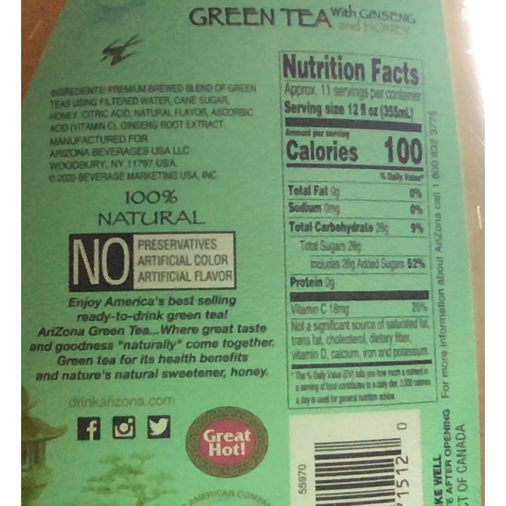 Arizona green tea nutrition label