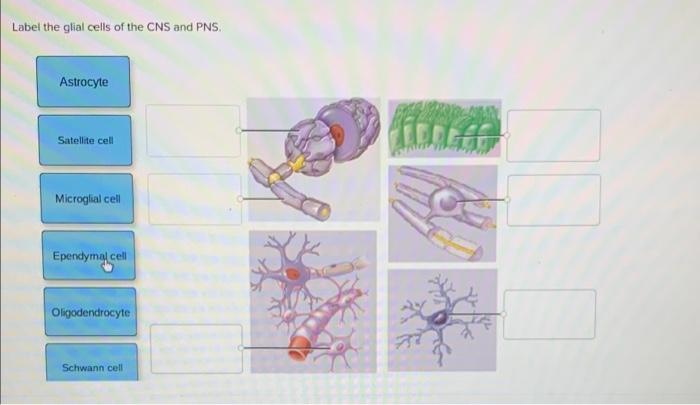 Solved Place the following labels in the proper position to - Chegg Most abundant CNS glial cells Oligodendrocytes Form the myelin sheath in the CNS Epenaymal cells Macrophages of the CNS Cols of the lymphatic system Microglia Function in the production and circulation of CSF Form the myelin sheath in the PNS Astrocytes Ciliated cells