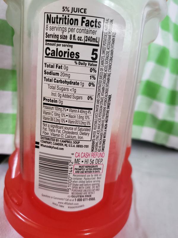 V8 label ingredients. Spicy Hot 100% Vegetable Juice - Campbell Soup Company The original V8 juice! This uniquely satisfying blend of vegetable juice is an excellent source of Vitamins A & C and helps you get 2 servings of vegetables in ... V8® Blends Ingredients - V8® Fruit and Vegetable Juices V8 Blends Lower Sugar and V8 Blends 100% Juice are delicious, healthy options for those looking for a perfect blend of vegetables and fruit. Low Sodium 100% Vegetable Juice - Campbell Soup Company V8 Low Sodium 100% Vegetable Juice gives you 2 servings of vegetables in every nutritious 8-ounce glass with two-thirds less sodium than regular V8 100% ... V8® Vegetable Juice Ingredients - Campbell Soup Company Carrots, celery, beets, parsley, lettuce, watercress and spinach juice are blended to create our unique flavor. These vegetables are grown mostly in the U.S. ...