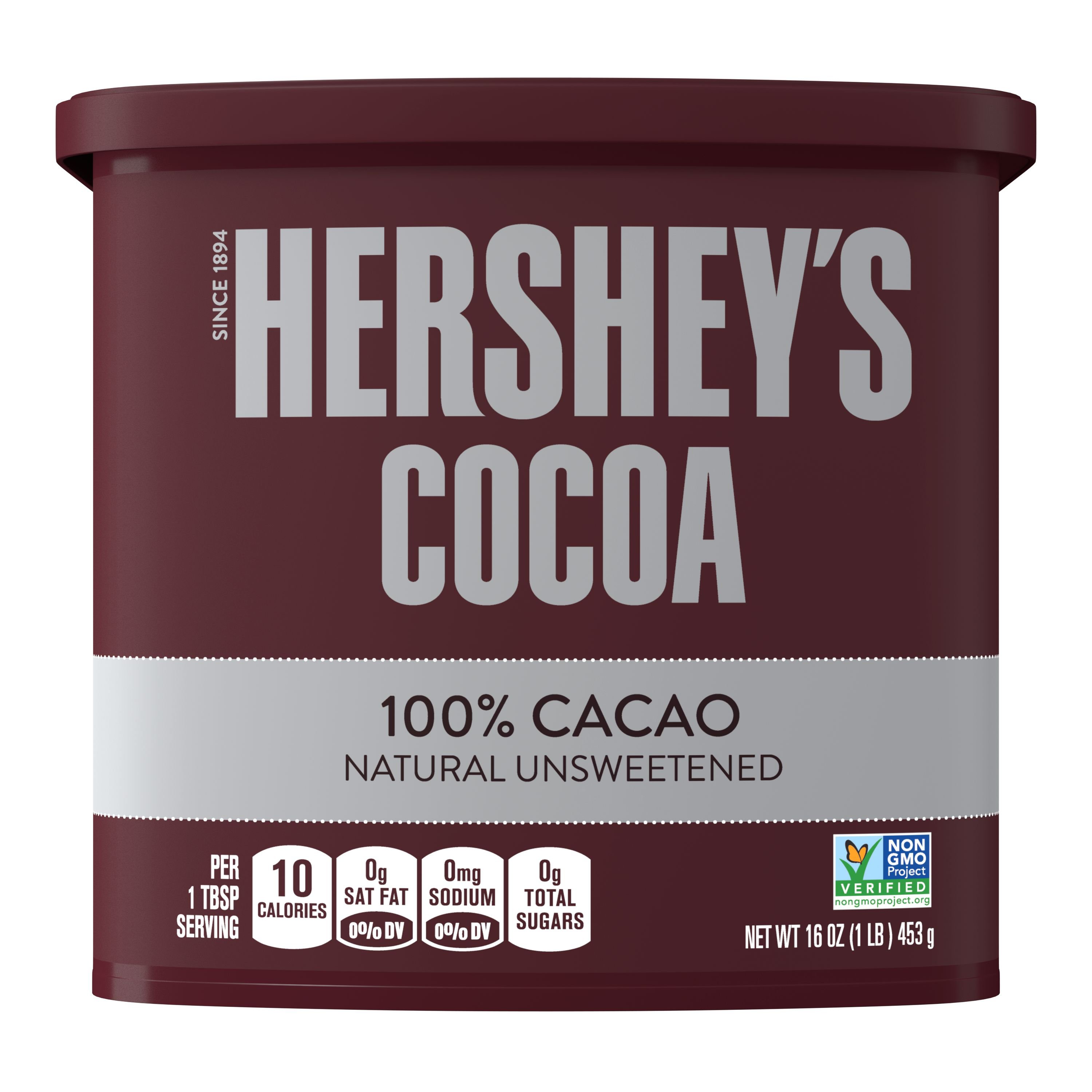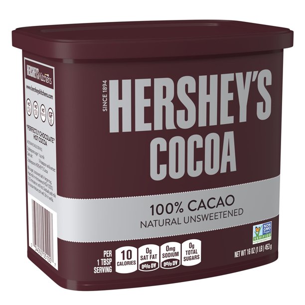 HERSHEY'S Naturally Unsweetened Cocoa, Baking Cocoa, 23 oz … About this item . Contains one (1) 23-ounce container of HERSHEY'S Naturally Unsweetened Cocoa ; From heavenly hot chocolate to fabulous frostings and gluten-free desserts, this 100 percent cacao is naturally unsweetened, highly versatile and 100 percent delicious
