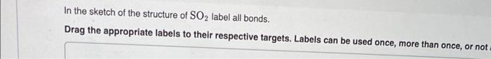 Solved Label all bonds in SO2. Label the diagram by dragging | Chegg.com Transcribed image text: Label all bonds in SO2. Label the diagram by dragging the labels to the appropriate targets. Label the diagram by dragging the labels to the appropriate targets. Note that not all labels will be used. o: S(sp) - O() : S(p) - (p) O: S(p) - (sp) Lone pair in p orbital T: S(sp?)