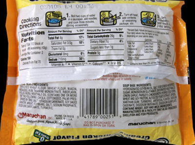 Ramen noodles by MARUCHAN nutrition facts and analysis. Ramen noodles by MARUCHAN contains 220 calories per 47 g serving. This serving contains 10 g of fat, 5 g of protein and 28 g of carbohydrate. The latter is 4 g ...