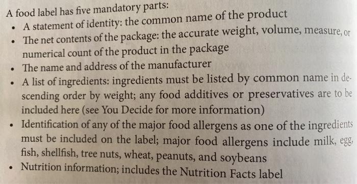 PDF Labeling - Food Safety and Inspection Service A Guide to Federal Food Labeling Requirements for Meat, Poultry, and Egg Products 4. 21 CFR Part 160 - FDA, HHS; Subpart B - Food for Human ... the ingredient statement or the product identity. 3. Applications for label approval are submitted to the Labeling and Program Delivery Staff (LPDS) a number of ways. a. Label submissions can be ... Standard of Identity, Petitions, Food Additives, Food Product Claims ... Despite the breadth of this statute, FDA has focused primarily on establishing standards of identity; FDA has not directed much attention to quality standards. FDA has 300 identity standards in 20 categories of food -- 21 CFR Parts 130 to 169. For example, the standard of identity for sherbert is specified in 21 CFR 135.140. food label important.PNG - Food Labels Five components must... View food label important.PNG from NTR 109 at SUNY Buffalo State College. Food Labels Five components must be included on Food Labels: A statement of identity Common name of the product or Standards of identity for food - Canadian Food Inspection Agency A standard of identity (or compositional standard) sets out what ingredients a product must contain, what ingredients it may contain, and any requirements of manufacturing. Standards of identity may also provide technical specifications regarding: permitted food additives